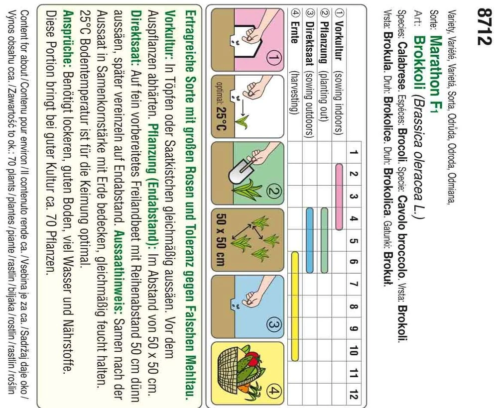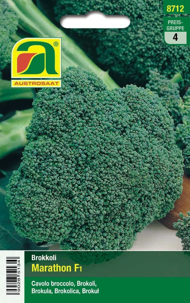 Austrosaat Brokkoli Marathon F1 (Brassica oleracea L.) ist eine sehr zuverlässige Sorte mit großen Rosen und guten Erträgen bei Frühpflanzung und Frühsommerernte sowie bei der Herbsternte. Tolerant auch gegen Falschen Mehltau.