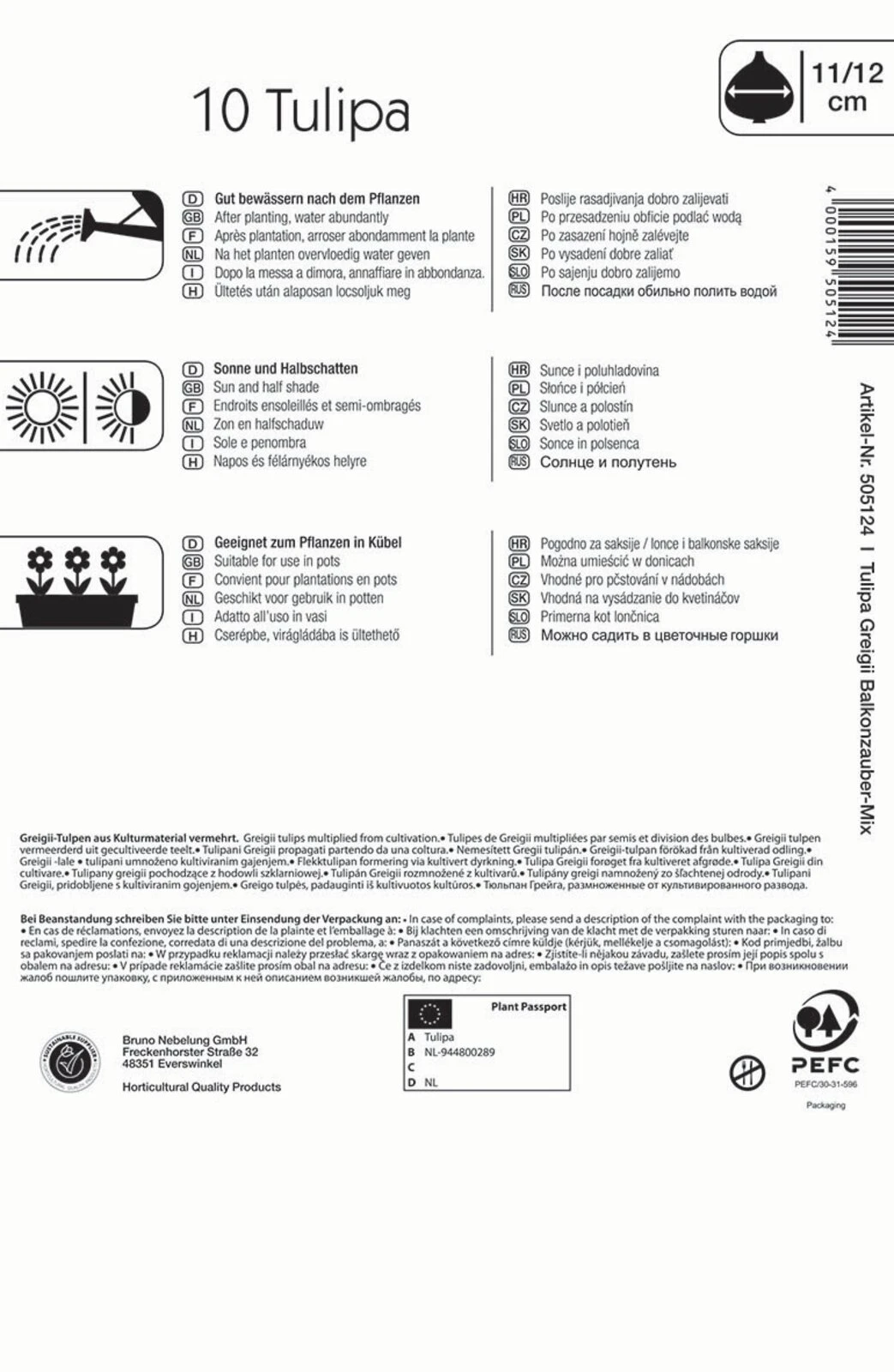 Dieser Mix der Greigii-Tulpe ‚Balkonzauber‘ bietet eine farblich ausgewogene Mischung an mehrblütigen Tulpen. In ihrer Farbvielfalt sind die gerade einmal 20 cm hohen Tulpen bestens als mehrjährige dekorative Bepflanzung von Balkon, Kübel und Töpfen geeignet. Besonders schön kommen sie in Kombination mit Hornveilchen zur Geltung. Werden die Zwiebeln in einen Kübel gesetzt, können sie unter anderem neben der Hauswand, in einer kühlen Garage oder unter Sträuchern überwintert werden. Nur bei Frösten unter -10° C sollte ein Winterschutz geboten werden. Um von April bis Mai blühfähige Blüten entwickeln zu können, benötigen die Zwiebeln nämlich eine Kühlphase. Ab Mitte bis Ende März können die Gefäße ins volle Licht gestellt werden.