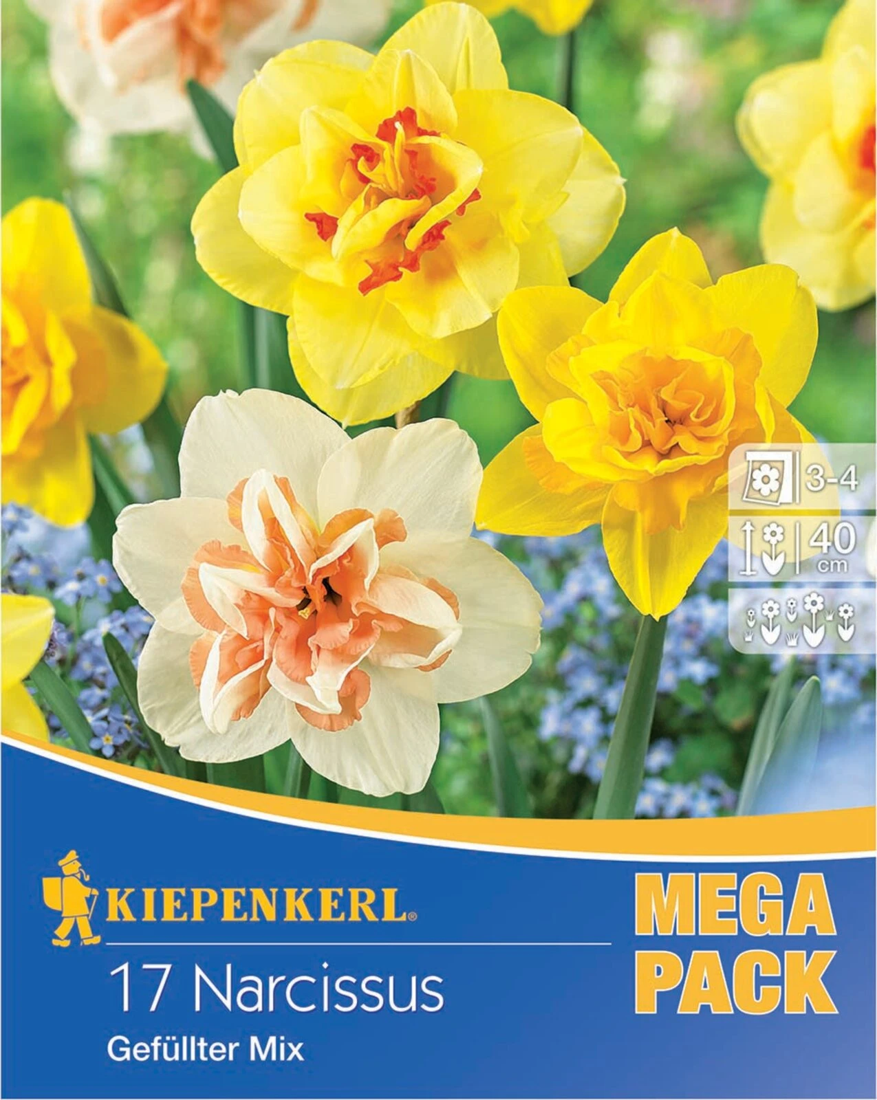 Wahre Frühlingsgefühle kommen auf, wenn das Mega-Pack „Narzissen Gefüllte Mischung“ im Garten blüht. Diese Mischung enthält sowohl intensiv-gelbe Narzissen als auch Narzissen, die in einem feinen Pastellgelb blühen. Die Blüten sind gefüllt und wirken dadurch besonders romantisch. Die Blumen wachsen auf eine Höhe von bis zu 40 cm heran und entfalten ihre Pracht von März bis April. Im Anschluss verwildern sie gut und kommen damit auch in den nächsten Jahren wieder. Alternativ dazu können Sie die hübschen Narzissen auch schneiden und einen schicken Frühlingsstrauß damit gestalten.